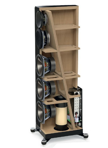 Tak mocna sekcja niskotonowa wymaga też adekwatnie solidnej obudowy. Układ wewnętrznych wzmocnień jest dość oryginalny, bo głównym elementem jest wieniec biegnący ukośnie, prawie po przekątnej, który w górnej części pełni rolę ścianki komory głośnika średniotonowego, zamkniętej od dołu małą poziomą przegrodą; we wspólnej komorze głośników niskotonowych poziomych wieńców jest więcej.