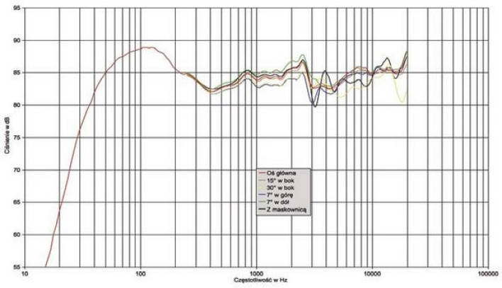 Należy wtedy usiąść trochę wyżej lub, co nietypowe, pochylić kolumny leciutko do przodu o kilka stopni (za pomocą samej regulacji kolców). Wpływ maskownicy widać w pomiarach jako zafalowania w okolicy 3 - 5 kHz, ale nie powinien on być znaczący dla brzmienia. Ładny kształt ma charakterystyka w zakresie niskotonowym - jest lekko wyeksponowana, jej nachylenie zwiększa się stopniowo, i mimo że zaczyna się już od 100 Hz, to spadek -6 dB względem wierzchołka pojawia się przy ok. 40 Hz, a względem poziomu średniego (85 dB) przy 34 Hz. Czego chcieć więcej od konstrukcji z dwoma 15-tkami?
