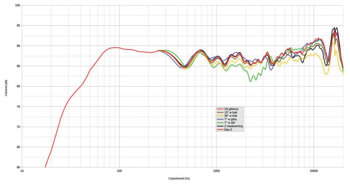 Można więc usiąść dość wysoko, nie odczuwając dużych zmian w brzmieniu; te pojawią się wyraźniej, gdy zejdziemy poniżej osi głównej, charakterystyka z osi -7º pokazuje obniżenie w zakresie 1–3 kHz, najgłębsze przy 2,2 kHz, co prawdopodobnie ma związek z częstotliwością podziału między średniotonowym a wysokotonowym (wg danych firmowych – 2,5 kHz) i pogorszeniem korelacji fazowej na tej osi.