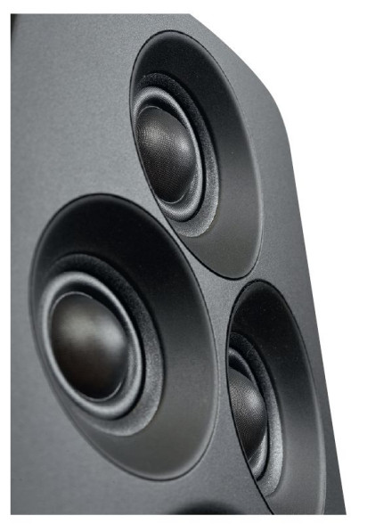 Z wielu powodów – aby zapewnić szerokie rozpraszanie z pojedynczego przetwornika (a dopiero potem regulować charakterystyki kierunkowe przesunięciami fazowymi między nimi), aby umieścić frontową trójkę jak najbliżej siebie, aby zmieścić wszystkie na ściankach o ograniczonych wymiarach. Jednocześnie musiał to być przetwornik o dużej wytrzymałości; z naszych pomiarów wynika, że częstotliwość podziału to ok. 300 Hz – niska, ale nie bardzo niska.