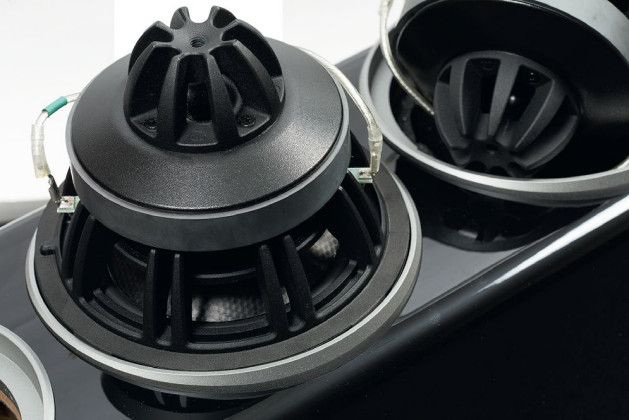 Moduł głośników średniotonowego i wysokotonowego jest osadzony w analogicznej, wspólnej aluminiowej ramce, ale trzymany śrubami niezależnymi dla obydwu głośników.