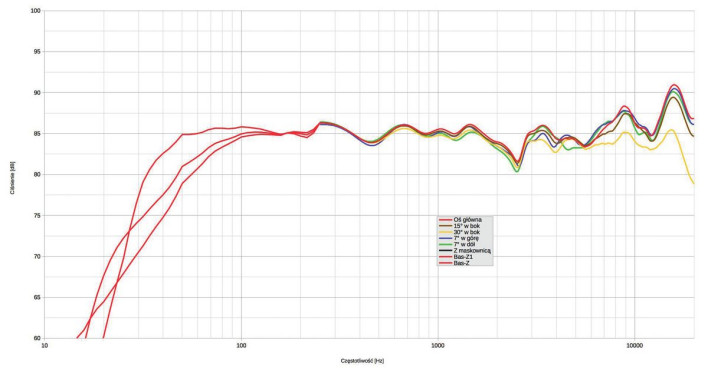To tylko przykład sytuacji, z jakimi często mamy do czynienia. Poza tym jest doskonale. Charakterystyka jest zrównoważona, wszystkie przebiegi (mierzone pod różnymi kątami) leżą bardzo blisko siebie, tylko ta z osi 30o, w zakresie najwyższych częstotliwości, trochę odstaje, ale to zupełnie naturalne. Ponadto dzięki temu, że skraj pasma jest na osi głównej (i blisko niej) lekko wyeksponowany (również za sprawą wspomnianego rezonansu przy 16 kHz), to pod kątem 30O, wyrównanie w skali całego pasma jest nawet lepsze, tylko z minimalnym obniżeniem wysokich tonów względem średnicy.