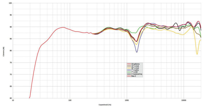 Najgłębsza zapadłość pojawia się pod kątem +7º (krzywa niebieska), na osi głównej (krzywa czerwona) jest już płytsza, ale wciąż wyraźna, praktycznie znika na osi -7º (krzywa zielona), co może być rezultatem zarówno najlepszej (na tej osi) korelacji fazowej między nisko-średniotonowymi i wysokotonowym, jak też między samymi nisko-średniotonowymi (pamiętajmy, że to układ dwudrożny, a nie dwuipółdrożny, i obydwie 18-tki pracują razem dość wysoko, aż do podziału z wysokotonowym).