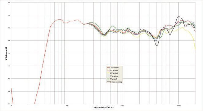 Nie jest źle; mimo wysokiego strojenia basrefl eksu (ok. 60 Hz), spadek -6 dB mamy przy 45 Hz. Tutaj fi rma trochę naciąga, podając pasmo 40 Hz - 35 000 Hz +/-3 dB, ale tylko trochę. Poziom w zakresie 50 - 300 Hz, zatem w szeroko (a raczej wysoko) rozumianym zakresie niskich tonów, jak też częstotliwości najwyższych, ma ok. 3-decyblową przewagę nad zakresem częstotliwości średnich; lekkim dołkiem przy 4 kHz prawdopodobnie zaznacza się druga częstotliwość podziału, widać też wpływ maskownicy, poza tym zbieżność charakterystyk z różnych osi jest bardzo dobra.