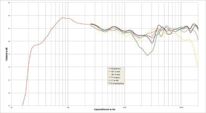Charakterystyka przetwarzania pokazuje dwa zakresy, wyłamujące się z liniowości. Wyeksponowane (ale nie dramatycznie) niskie częstotliwości sięgają bardzo daleko, niskie strojenie bas-refl eksu w tym przypadku wywołało "kolano" przy 30 Hz, do którego zbocze jest dość łagodne, i punkt -6 dB (względem poziomu 86 dB) pojawia się właśnie w tych okolicach. Wyniki te dotyczą wariantu z działającym układem bas-refl eks, zamknięcie otworu spowodowałoby niechybnie obniżenie poziomu niskich częstotliwości. Na przełomie średnich i wysokich częstotliwości widać natomiast osłabienie - ale tylko pod kątem -7O; na osi głównej i powyżej jest dobrze, a w zakresie wysokich częstotliwości - wręcz doskonale, pod warunkiem, że bez maskownicy, która atakuje zakres 3-4 kHz wyraźnym "schodkiem".