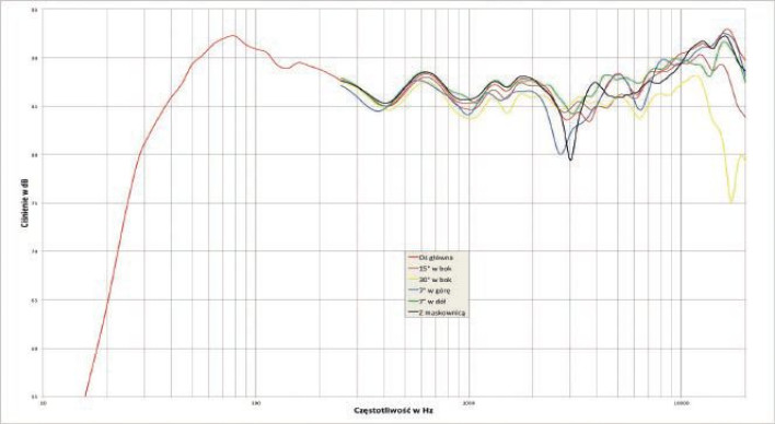 Wyeksponowanie skrajów pasma (już na charakterystyce przetwarzania) przeprowadzone jest bez wpływu na dość równo prowadzony, szeroki zakres średniotonowy, na którym widać tylko wąskopasmowe osłabienie w okolicach częstotliwości podziału (3 kHz), i to tylko pod kątem +7O (w górę) lub po założeniu maskownicy; na pozostałych osiach jest bardzo ładnie, nie widać żadnego śladu łączenia przetworników wysokotonowych, a wzmocnienie tego zakresu na osi głównej wynika z założenia, że kolumny będą stały równolegle, a niewycelowane w miejsce odsłuchowe, a wtedy pod lekkim kątem (15O) powinno być optymalnie. W zakresie niskotonowym mamy i wysoki poziom, i dobre rozciągnięcie, spadek -6 dB pojawia się niedaleko 30 Hz - wyśmienicie!