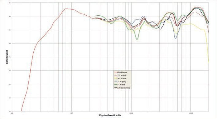 Wracając do charakterystyki przetwarzania: jest ona ogólnie dobrze zrównoważona, z kilkoma charakterystycznymi "momentami": na osi -7O (w dół) pojawia się osłabienie niedaleko 1 kHz, to prawdopodobnie niezgranie fazowe między sekcją niskotonową a średniotonowym przy wysoko ustalonej częstotliwości podziału; osłabienie przy 5,5 kHz pojawia się pod kątem +7O (do góry), ale jeżeli jest to niezgranie fazowe między średniotonowym a wysokotonowym, to częstotliwość podziału leży znacznie wyżej, niż podaje producent (3 kHz); o ile będziemy trzymać się standardowej wysokości (90-100 cm), to problemy takie nie pojawią się, a maskownica też specjalnie nie zaszkodzi.