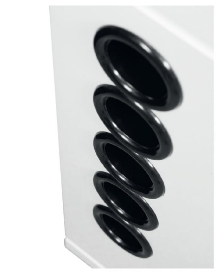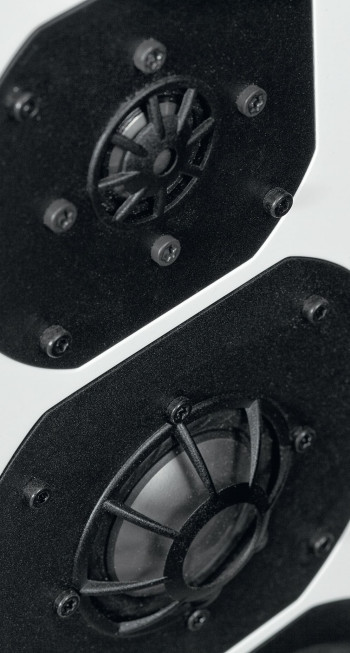 Sugestię taką wspiera też oryginalnie wyglądający rząd pięciu otworów, które wypromieniowują ciśnienie… przecież nie z ogromnego układu bas-refleks, w którym pracowałaby tylko jedna 16-tka! Chyba więc nikt się nie zmartwi tym, że w środku siedzi para 25-cm niskotonowych, a jak dokładnie, wyjaśnimy dalej.
