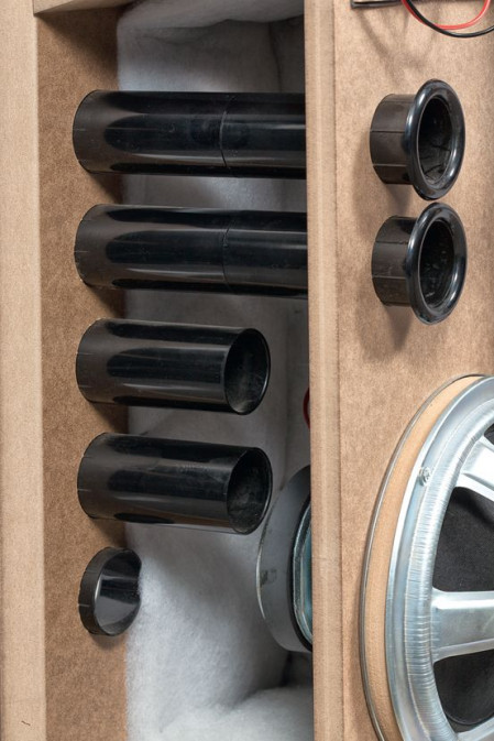 Bezpośrednio z niej zostały wyprowadzone trzy krótsze tunele, z których umieszczony najniżej jest najkrótszy (praktycznie tylko na grubość przedniej ścianki). Nie oznacza to, że pracują istotnie inaczej – połączone z jedną objętością, ustalają jedną wspólną częstotliwość rezonansową (określoną przez całkowitą masę powietrza w tunelach, łączną powierzchnię i objętość komory).