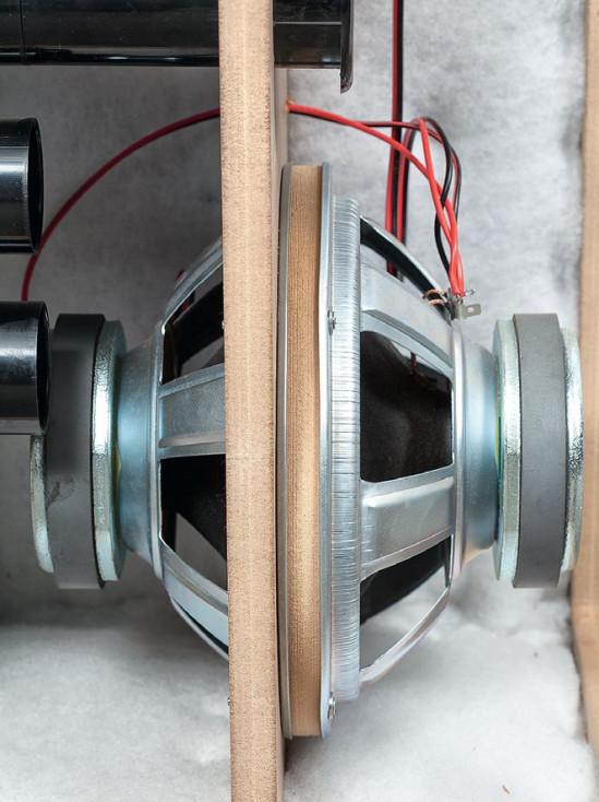 Głośniki znajdujące się wewnątrz są złożone "czoło do czoła", ale oczywiście podłączone jak w układzie push-pull – nie sprężają powietrza pomiędzy sobą, lecz w każdym ruchu "przesuwają" je w tę samą stronę. Wymaga to oczywiście "odwrócenia" polaryzacji jednego z nich (aby obydwa pracowały zgodnie fazowo).