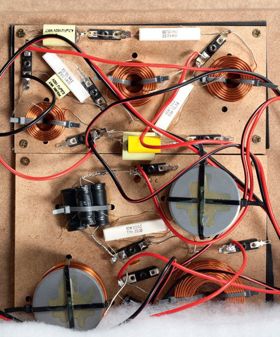 Schemat zwrotnicy z dokładnymi wartościami można znaleźć w Internecie, więc nie będę ich tutaj po kolei wszystkich przytaczał. Podstawowe fakty są takie: sekcja niskotonowa jest filtrowana w najprostszy sposób, jedną dużą cewką (rdzeniową), ale pamiętajmy, że sama obudowa jest dolnoprzepustowym filtrem akustycznym i filtr elektryczny dodatkowo zwiększa nachylenie zbocza, które w pomiarach okazuje się bardzo strome już w oktawie 100–200 Hz.