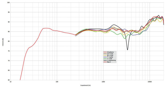 W widoczny sposób "wchodzi w szkodę" maskownica, powodując najpierw podbicie przy ok. 1,7 kHz, a wyżej wąskopasmową zapadłość przy 3,3 kHz, co wynika z jej grubości i braku wyprofilowań (ścięć, zaokrągleń) krawędzi (wewnętrznych). Chociaż takie efekty nie muszą być "destrukcyjne" dla brzmienia, to ten element warto i przecież łatwo poprawić.