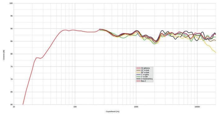 Charakterystyka z osi -7º ma odrobinę niższy poziom niż ta z osi +7º, co widać najlepiej na samym skraju pasma. Ale to przecież różnice marginalne, nieistotne z praktycznego punktu widzenia, obserwujemy je tylko dla teoretycznych rozważań. Kluczowe dla jakości jest to, że konstruktor tak doskonale opanował stabilność charakterystyk w wystarczająco szerokim zakresie kątów, że nie ma znaczenia to, czy usiądziemy trochę niżej czy trochę wyżej, czy trochę z boku.