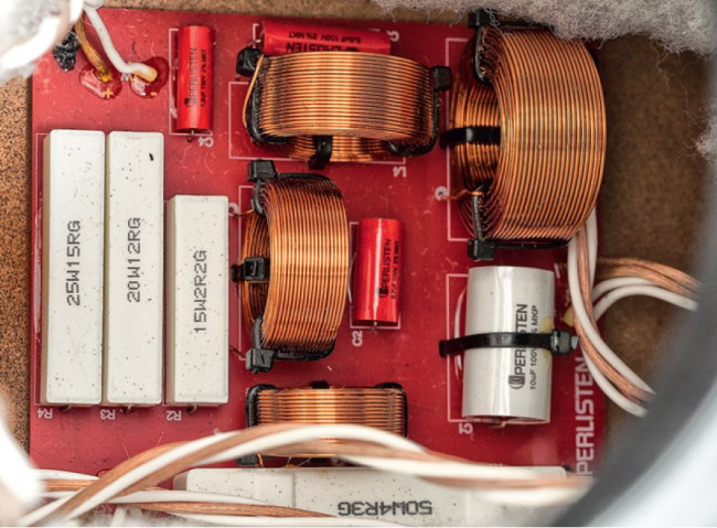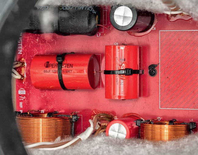 Producent nie pisze wiele o zwrotnicy, ale udało się ją znaleźć. Jest nieco mniej skomplikowana niż w R7t (zwłaszcza w sekcji 18-tek) i poczytuję to wyłącznie za zaletę. Rolą zwrotnicy jest doprowadzić charakterystyki do założonego kształtu, uporządkować je, a w tym przypadku, ze względu na wymagania THX, było to zadanie szczególnie trudne, jednak całkowicie się udało, co pokazują również nasze pomiary.