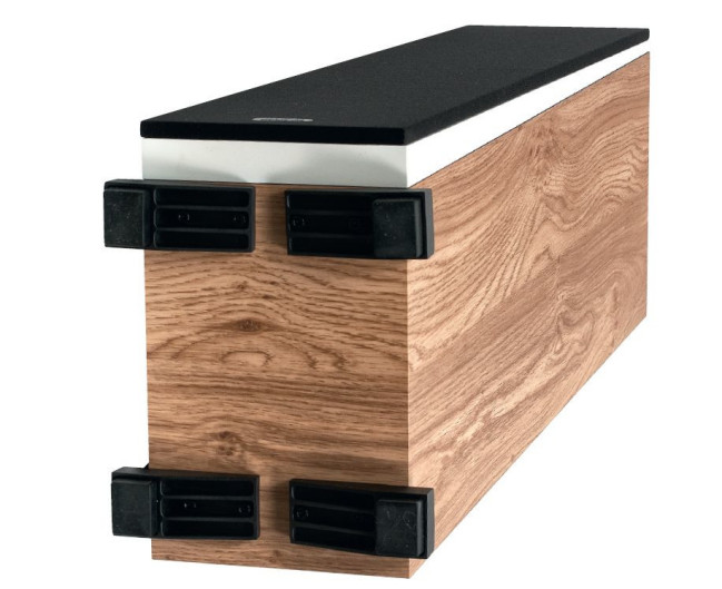 Front panel jest lekko pochylony, mimo że korpus, w którym jest osadzony, pozostaje regularnym prostopadłościanem, stojącym pionowo. Wymagało to prostego zabiegu – front o stałej grubości 30 mm jest osadzony głębiej na górze (tutaj wystaje 1 cm przed krawędzie "skrzynki") i płycej na dole (tu wystaje 2,5 cm).