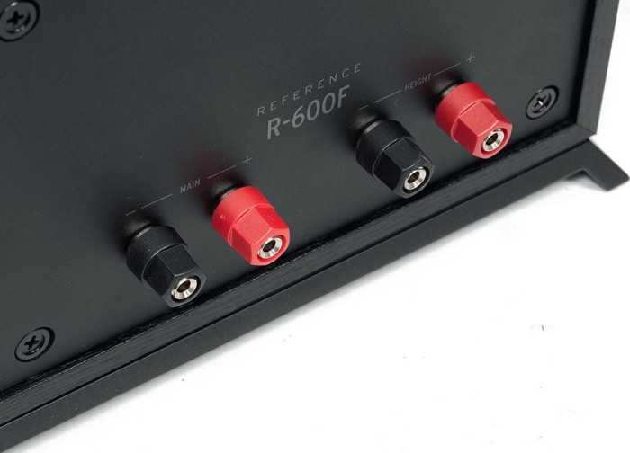 Dodano terminale ułatwiające podłączenie głośników atmosowych, które mielibyśmy ustawić na górnej ściance R-600F, ale jeżeli ktoś jest od razu zdecydowany na takie rozwiązanie i zastosowanie R-600F w kinie domowym, niech lepiej kupi model R-605FA, który jest już wyposażony w sekcję atmosową. Co ciekawe, większy model R-800F nie ma takiej wersji.