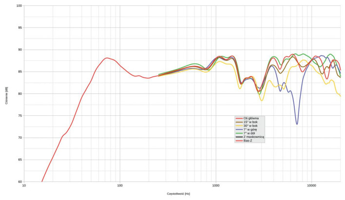 Oczywiście jak zwykle przeprowadziliśmy też pomiary na innych osiach, które pokażą charakterystyki biegnące nieco niżej i wyżej. Osłabienie w zakresie 2–3 kHz jest jednak niewrażliwe na zmianę osi, co samo w sobie też jest nietypowe, bowiem zwykle podobne zjawiska (w tym zakresie) wiążą się z częstotliwością podziału, gdzie charakterystyka wypadkowa zmienia się (zwłaszcza w płaszczyźnie pionowej) wraz ze zmianami relacji fazowych promieniowania współpracujących przetworników (o ile nie jest to układ koncentryczny).