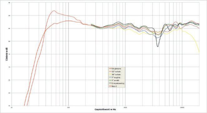 Poza jednym - maskownica lokalnie, ale dość ostro, "wcina się" przy 3,8 kHz, wypada ją więc zdjąć. Warto zwrócić uwagę na piękny, gładki przebieg w dwóch najwyższych oktawach, aż do 20 kHz, i bardzo dobre rozpraszanie - dopiero pod kątem 30O charakterystyka opada wyraźnie wcześniej, ale i tak do 10 kHz trzyma się bardzo dobrze. Wróćmy do basu.