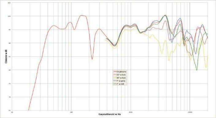 Charakterystyka widoczna na tle całego pasma akustycznego pokazuje dobrą ogólną równowagę, z basem wzmocnionym przez działanie tuby w zakresie 100-200 Hz, ale też całkiem dobrze rozciągniętym. W zakresie średnio-wysokotonowym widać, że wzmocnienie 4 kHz na osi głównej, ustępuje do niegroźnych już rozmiarów na osi 15o, a na osi 30o zakres powyżej 3 kHz jest już zbyt obniżony - to efekt pracy aż do 10 kHz głośnika szerokopasmowego o dużej średnicy, który na osi głównej jeszcze daje sobie radę, ale z rozpraszaniem idzie mu już znacznie gorzej (charakterystyki kierunkowe są w dużym stopniu uzależnione od średnicy membrany). Ustawmy jednak kolumny tak, aby nasza głowa znajdowała się na wysokości ok. 100 cm, w pobliżu osi 15o (a więc nie do końca skręcona w stronę miejsca odsłuchowego), włączmy superwysokotonowy w odwróconej polaryzacji, a powinno być całkiem dobrze. O wiele lepiej niż w Grand Crescendo...