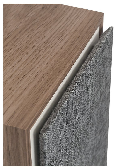 Chociaż budżet nie pozwalał na wielkie luksusy, to obudowa jest wykonana solidnie, a kolorystyka i detale są gustowne. Przygotowano aż cztery wersje kolorystyczne: biały front (i biały cokół) ze skrzynką białą lub w imitacji dębu, czarny front (i czarny cokół) ze skrzynką czarną lub w imitacji orzecha. Wersja biało-orzechowa (na zdjęciach) ma specjalny materiał maskownicy – popielato-szary, melanżowy, modny i tutaj pasujący. Maskownica jest mocowana przez magnesy, i mimo że w pomiarach jej negatywny wpływ jest minimalny, producent zaleca, aby zdjąć ją podczas odsłuchów. Tym razem nie jest to jednak tak konieczne jak w innych przypadkach.