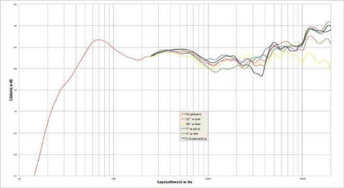 A tak przebieg jest "fizjologiczny" - lekko wzmocnione skraje pasma, wycofany "górny środek" - i może być przyjemnie. Jeżeli jednak nie chcemy pogłębiać obniżenia średnich tonów, nie siadajmy zbyt nisko (na osi -7O widać najniższy poziom w zakresie 1-2 kHz), i lepiej zdejmijmy maskownicę - dołek przy 3,5 kHz nie jest dramatem, ale nie będzie nam też potrzebny, poziom w tym zakresie i tak nie jest wysoki.