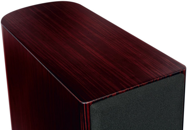 Inne wersje to lakierowanie na czarno, biało i srebrno, ale do tych kształtów egzotyczny fornir pasuje najlepiej. Dolna ścianka jest na stałe uzupełniona stalową płytą wychodzącą poza obrys obudowy w miejscach instalacji kolców; kolumna jest więc ustabilizowana z dużym zapasem, nawet gdyby kolce były instalowane w obrysie, trudno byłoby ją przewrócić.