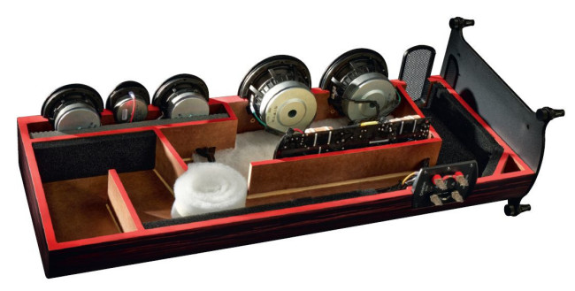 Głębokość też jest znaczna – 43 cm. Do tego cała obudowa jest pochylona, i to nie w prosty sposób, ale podczas gdy front i tył są ustawione pod kątem kilku stopni, górna i dolna ścianka są w poziomie. Biorąc pod uwagę zainstalowanie wewnątrz wielu przegród, to naprawdę skomplikowana obudowa, wymagająca najwyższej dokładności wykonania poszczególnych elementów, złożenia i wykończenia powierzchni zewnętrznych.
