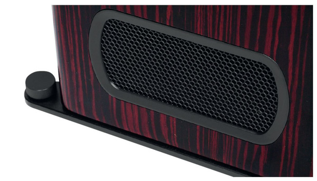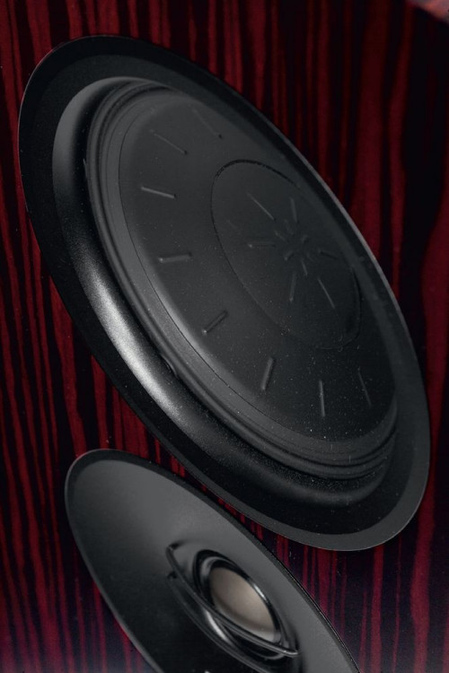 Przednia ścianka jest pochylona z powodu relatywnie niskiego ustawienia przetwornika wysokotonowego, a dokładnie rzecz ujmując – symetrycznej sekcji średnio-wysokotonowej.