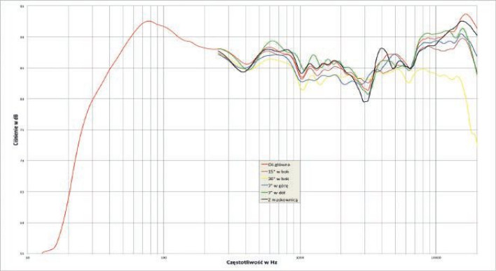 Tym razem, żeby środka pasma bardziej nie "dołować", usiądźmy raczej nieco niżej, niż wyżej (na osi +7O poziom w zakresie 1-2 kHz jest najniższy), zdejmijmy też maskownicę, która trochę za bardzo się wtrąca w okolicach 3-4 kHz. Bas sięga nisko - spadek -6 dB względem poziomu średniego pojawia się poniżej 40 Hz.