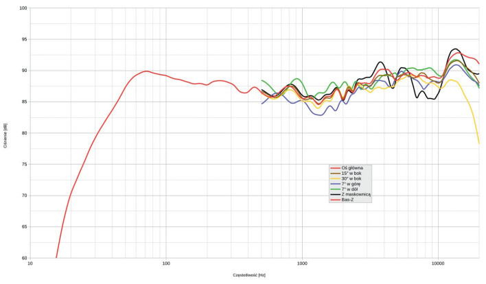Aby ją odbierać, trzeba jednak usiąść dość nisko (oś główna została ustalona na wysokości 100 cm, pomiędzy kopułkowym a wstęgowym), a najniższy poziom średnich tonów mamy na osi +7º (ale raczej nie grozi nam, abyśmy usiedli tak wysoko). W okolicach deklarowanej częstotliwości podziału (2,4 kHz) nie widać już poważnych zmian. Maskownicę zdecydowanie należy zdjąć z powodów wyraźnie widocznych (krzywa czarna).