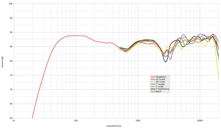 Maskownica trochę zwiększa nierównomierności na przełomie średnich i wysokich tonów, lepiej więc ją zdjąć, ale dramatu nie ma. Oś główną ustawiliśmy na wysokości 90 cm – jest ona zarówno praktyczna, jak i zgodna z tradycyjnym "konstrukcyjnym" zaleceniem, aby wyprowadzać ją pomiędzy średniotonowym (lub nisko-średniotonowym) a wysokotonowym.