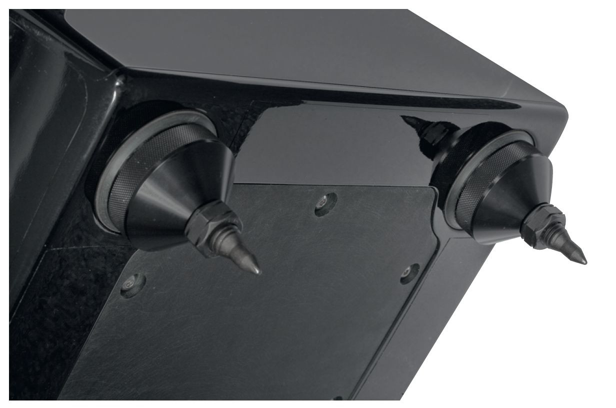 X jest wciąż głównym budulcem, ale front wykonano już… wcale nie z materiału V, lecz z jeszcze innego, najnowszego – H, charakteryzującego się większą stratnością wewnętrzną, co ma się przełożyć na lepsze przetwarzanie średnich częstotliwości, natomiast materiał V zastosowano w dolnej ściance, w miejscu instalacji kolców, gdzie wraz z nimi ma tworzyć barierę dla wibracji. Kolce będące na wyposażeniu są bardzo solidne, ale można je wymienić na jeszcze lepsze – Acoustic Diodes.