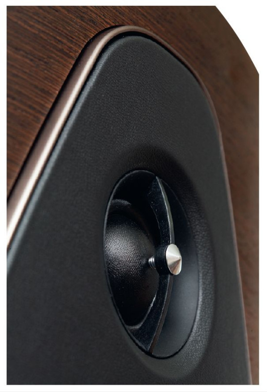 Maskownica jest podzielona na dwa koła, niezależne dla głośników niskotonowych, i zaokrąglony trapez zakrywający sekcję średnio-wysokotonową, którą integruje też panel wykończony skórą. Wokół niego, jak i wokół pierścieni maskujących kosze głośników niskotonowych, dyskretnie błyszczą listwy, których nie zasłaniają maskownice.