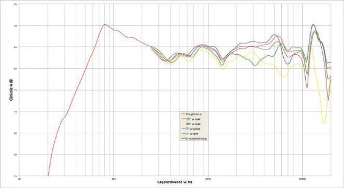 Średni poziom w całym pasmie to 87 dB - dobry wynik przy 6-omowej impedancji znamionowej. Widoczne pofalowanie charakterystyki jest utrzymywane w granicach dobrego ogólnego zrównoważenia, przy umiarkowanym wzmocnieniu skrajów pasma. Widoczna jest jednak duża różnica między charakterystykami zmierzonymi na różnych osiach w płaszczyźnie pionowej, pojawiająca się już od 2 kHz; delikatniejsze brzmienie obiecywałbym sobie po charakterystyce leżącej najniżej, czyli na osi -15 st.