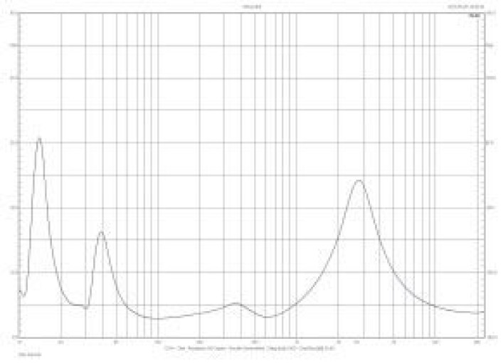 Zmierzona charakterystyka modułu impedancji nie uspokaja, że to minimum występuje gdzieś na górnym skraju pasma, co pozwalałoby "ostatecznie" zgodzić się na 8-omową impedancję znamionową, opierając się na fakcie, że tam zapotrzebowanie na moc jest już niewielkie i nie obciąża wzmacniacza.