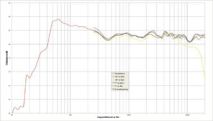 Natomiast spadek, jaki widać pod kątem 30O, powyżej 7 kHz, jest wpisany we własne charakterystyki kierunkowe przetwornika wysokotonowego i konstruktor zespołu nie ma tu praktycznie nic do zrobienia. Widać jednak pewną ciekawą tendencję, która przez mniej zaznajomionych z charakterystykami kolumn może zostać przeoczona - poziom wysokich nie jest ani odrobinę wyższy niż średnich (a zwykle jest), z kolei przełom średnich i wysokich, zakres 2-4 kHz, jest podany dość mocno, bez najmniejszego "zwyczajowego" cofnięcia.