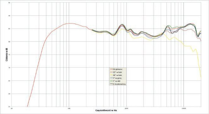 Charakterystyka przetwarzania utrzymuje się w ścieżce +/-2,5 dB nie tylko na osi głównej, ale też pod kątami +/-7 st. w płaszczyźnie pionowej i 15O w płaszczyźnie poziomej, a także z założoną maskownicą - różnice trzeba wręcz wyłuskiwać. Dopiero pod kątem 30O widać wyraźny spadek w zakresie wysokich częstotliwości. Lekkie obniżenie poziomu w zakresie 2-4 kHz jest zabiegiem wychodzącym naprzeciw krzywej czułości naszego słuchu, przeprowadzonym tutaj bardzo subtelnie.