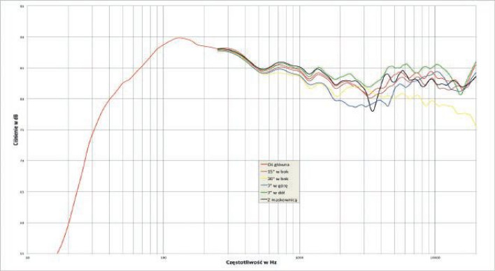 Na charakterystyce przetwarzania widzimy wzmocnienie zakresu nisko-średniotonowego i osłabienie, wraz z dużą zmiennością (uzależnione od osi pomiaru) zakresu 1-5 kHz. Układ jest symetryczny, a taki jest wrażliwy na zmianę kąta w płaszczyźnie pionowej, jednak dlaczego inne zmiany widzimy pod kątem +7O, a inne pod kątem -7 st.?