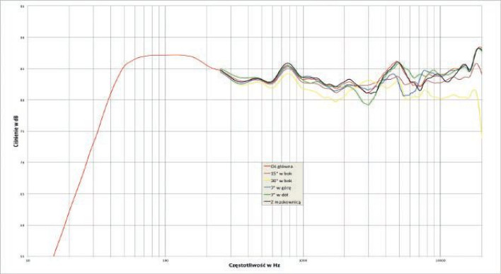 Pasmo przenoszenia zostało zadeklarowane jako 37 Hz - 30 kHz, i dokładnie przy 37 Hz widzimy spadek -6 dB (względem średniego poziomu). Swoją drogą, to bardzo dobry wynik. Charakterystyka zmierzona na osi głównej mieści się ścieżce +/- 2,5 dB, pokazując delikatne obniżenie w zakresie średnich częstotliwości, z bardzo niewielkimi zmianami na osiach +/-7 st. (w dół lekkie obniżenie przy 3 kHz, w górę - przy 6 kHz), więc nie trzeba się rygorystycznie trzymać osi głównej.