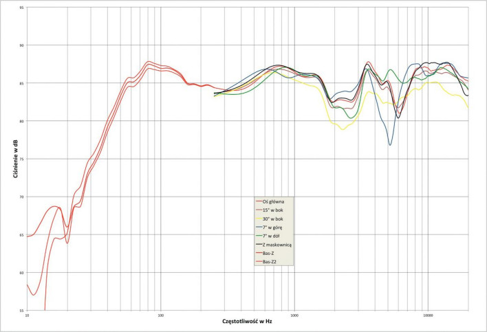 Charakterystyka zmierzona pod kątem 15O st. w płaszczyźnie poziomej (brązowa) leży bardzo blisko charakterystyki z osi głównej, odstępuje od niej najwyżej na 1 dB, ale charakterystyka zmierzona pod kątem 30O leży już znacznie dalej. Ciekawe zmiany widać na osiach ustalonych 7O w górę i w dół. Mamy do czynienia z filtrami niższego rzędu, więc zmiany są niemalnieuchronne, a mimo to, po pierwsze, nie są one bardzo duże, nie psują charakterystyki tak, jak przy takim filtrowaniu się zdarza, a po drugie to, że jednak są, i są niekorzystne (dołek przy 2,5 kHz na -7 st., zapadłość przy 5 kHz na +7O) pokazuje, że bardzo dobrze ustalono oś główną.
