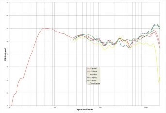 Zapominając o częstotliwościach ultrasonicznych, a skupiając się w zakresie akustycznym, widzimy bardzo ładną charakterystykę, umiejętnie i z pewnością świadomie wyprofilowaną tak, aby lekko uwypuklić skraje pasma; niewielkie rozejście się charakterystyk widać w okolicach drugiej częstotliwości podziału - osłabienie przy 3-4 kHz na osi +7 st. Najładniejsza charakterystyka biegnie na osi -7º, czyli gdy usiądziemy dość nisko, ale różnice są na tyle delikatne, że nie należy z tego robić problemu. Z wpływem maskownicy też nie ma problemu, ponieważ nie ma jej w ogóle.