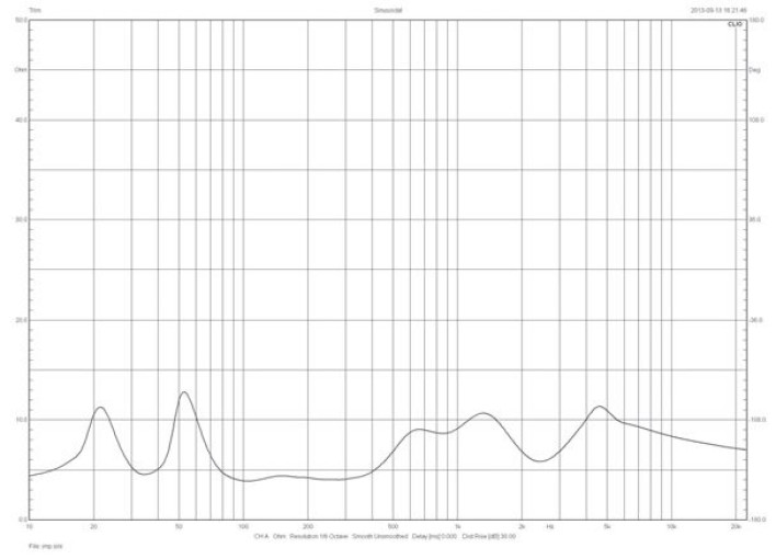 Również Elac wzbudza naszą sympatię i zaufanie rzetelnie zadeklarowaną impedancją znamionową. Bez żadnych wybiegów i wykrętów, firma podaje 4 ohm, jeszcze doprecyzowując, że wartość minimalna, występująca przy 95 Hz, wynosi 3,5 ohm. Nikt rozsądny nie powinien się w takiej sytuacji przestraszyć, zadanie wzmacniaczowi ułatwi także, podobnie jak w przypadku Virgo 25 Plus, niewielka zmiennność impedancji, chociaż charakter zafalowań w zakresie średnio-wysokotonowym wskazuje, że konstrukcja opiera się na dość rozbudowanych filtrach wyższego rzędu. W zakresie niskotonowym sytuacja wygląda konwencjonalnie - układ bas-refleks dostrojono do ok. 35 Hz (minimum między dwoma wierzchołkami).