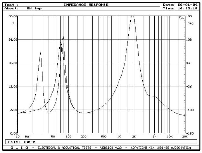 Na rys. 1 przedstawiamy tradycyjnie charakterystykę impedancji, lecz tym razem widzimy w zakresie niskich częstotliwości przebieg rozdwojony bez obaw, nic się nie popsuło, nałożyliśmy na siebie charakterystyki dla obudowy zamkniętej (pojedynczy rezonans przy 70Hz) i z działającym bass-reflexem (dwa wierzchołki przy 30 i 80Hz) Teraz nas jednak najbardziej interesuje poziom w minimum przy 200Hz odczytujemy ok. 5,5Ω i na tej podstawie stwierdzamy, że 705 są znamionowo 6-omowe. Co prawda nie 8-omowe, jak deklaruje producent, ale nie ma się czego obawiać. Przyda się tylko trochę mocy, bo efektywność wynosi 85dB.