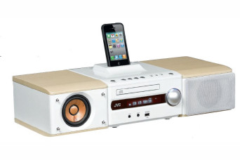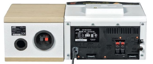 Trzeba przyznać, że projekt obudowy JVC EXS1 + SP-EXS1 odbiega od standardu metalowego klocka i już samo to robi dobre wrażenie. Wykonanie nie budzi żadnych zastrzeżeń. Szczególnie wersja biało-brzozowa prezentuje się stylowo, chociaż i czarno-brązowa jest OK. Srebrne przyciski na górnej powierzchni jednoznacznie wskazują na źródła muzyki - CD, iPod, USB, Tuner, Audio In.