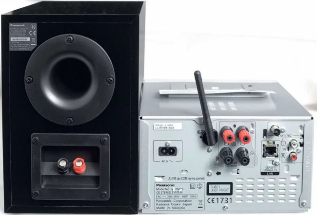 Pod otwieraną klapką na górze obudowy Panasonic SC-PMX9 znajduje się stacja dokująca dla sprzętu Apple najnowszej generacji, wyposażona w wąskie złącze Lightning. Końcówki mocy pracują w klasie D, w jej firmowej wariacji o nazwie LincsD-Am, kładącej wyraźny nacisk na układy eliminujące wysokoczęstotliwościowy szum na wyjściu.
