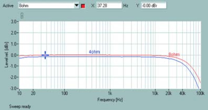 Pod względem zniekształceń obciążenie 4Ω tylko minimalnie ustępuje pola 8Ω (rys. 3), ale w takim wymiarze jest to zjawisko zupełnie normalne.