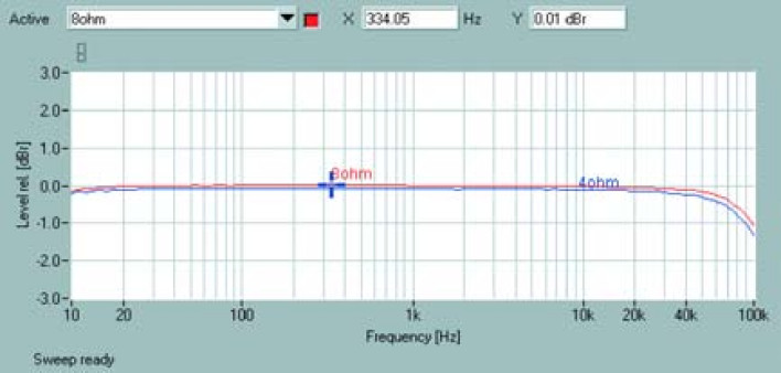Pasmo przenoszenia (rys. 1) obrazuje znakomitą liniowość pracy w zakresie niskich częstotliwości, przy 10 Hz spadek jest niemal niewidoczny. Powyżej 30 kHz widać rozpoczynające się obniżenie charakterystyki, ale nawet przy 100kHz spadek tylko ok. -1 dB.