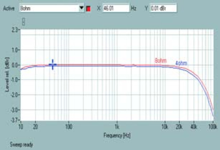 Urządzenie dysponuje niższym wzmocnieniem napięciowym dla 4 omów w porównaniu do 8 omów, można to zobaczyć na wykresie pasma przenoszenia z rys. 1. Wyrównanie częstotliwościowe jest idealne, przy 10Hz spadek wynosi tylko -0,3dB dla 8 omów i -0,2dB dla 4 omów. W górnych zakresach badanego pasma spadek -3dB notujemy przy 92kHz, podczas gdy na 8 omach osiągamy nawet 100kHz.