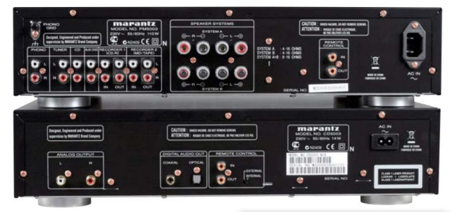 Z tyłu zwracają uwagę oddalone od siebie gniazda analogowe RCA, są też cyfrowe elektryczne i optyczne, a także gniazda RCA do komunikacji systemowej między urządzeniami Marantza. Wnętrze podzielono na kilka płytek, najpewniej produkowanych przez różnych podwykonawców.