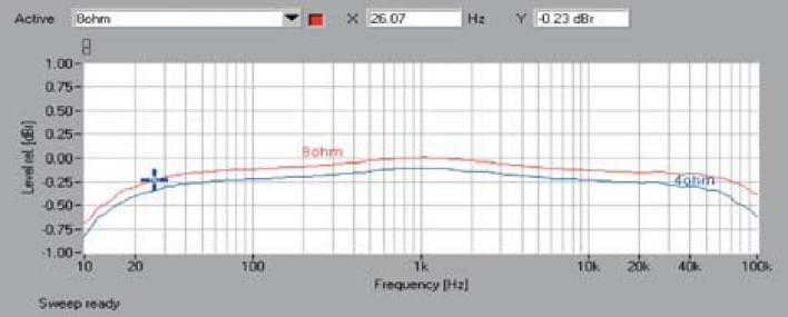 Nieczęsto zdarza się okazja do chwalenia tak taniego wzmacniacza za niski poziom szumów. Marantzowi należą się więc duże brawa - wskaźnik S/N osiągnął znakomity poziom 92 dB, co przełożyło się natychmiast na 109-dB dynamikę, a przecież PM5003 nie powala mocą wyjściową. Pasmo przenoszenia (rys. 1) prezentuje się nietypowo, mimo przeróżnych kombinacji i ustawień pokręteł regulacji barwy oraz trybu Direct nie udało się uzyskać płaskiego przebiegu charakterystyki, udaje się jednak utrzymać w granicach spadków jednodecybelowych w całym zakresie 10-100000 Hz.